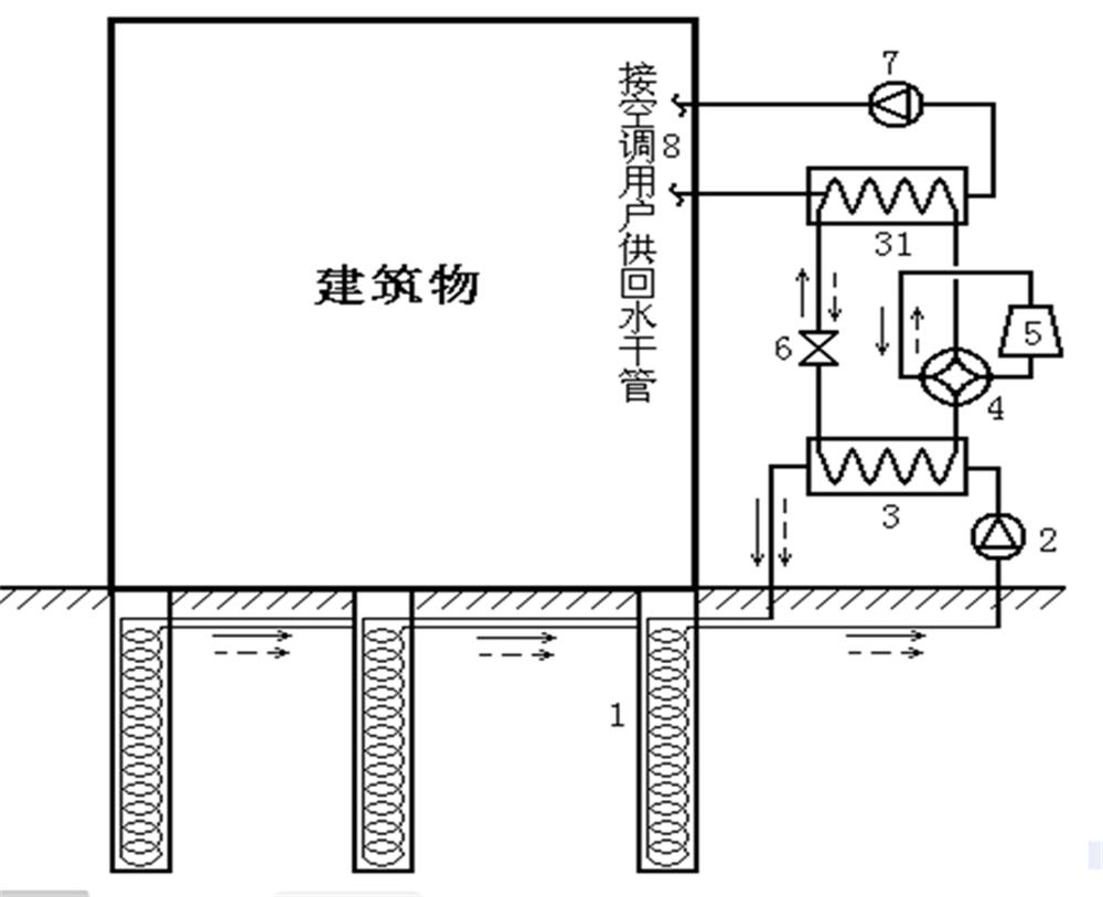 【帶樁基螺旋管地熱換熱器的地源熱泵系統(tǒng)示意圖】